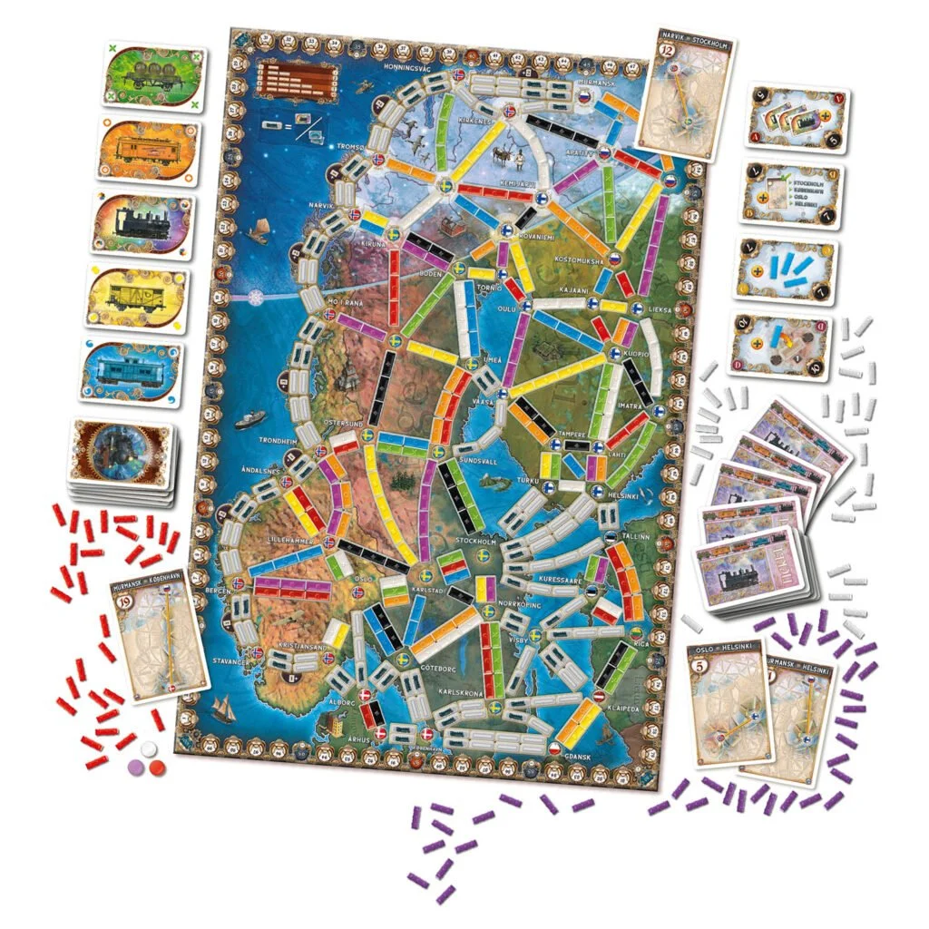 All aboard for an enchanting train-building adventure! Travel through a stunning Nordic landscape and witness the magic of the aurora borealis as you strategize your routes. Explore capital port cities, always buzzing with activity, or savor the fjords beyond the arctic circle. Build railroads through the countryside, forests and mountains that make this region unique.
