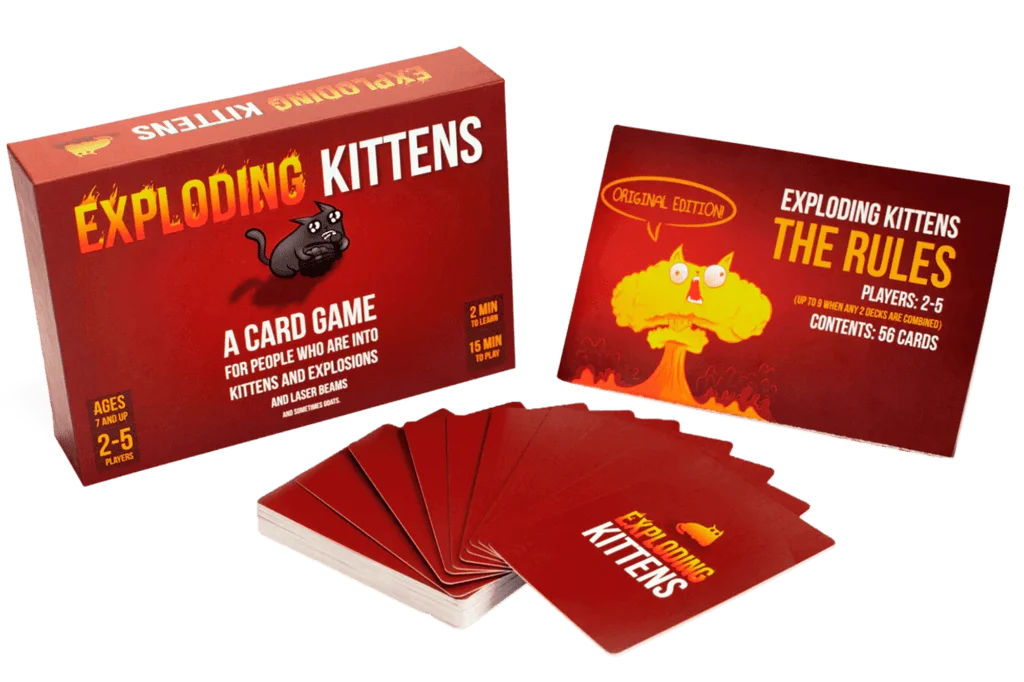 This cheeky game of strategy and chaos will have everyone laughing as you try to avoid drawing the dreaded exploding kitten card! Exploding Kittens is a highly-strategic, kitty powered version of Russian Roulette. Players draw cards until somebody draws an Exploding Kitten, at which point they explode and are out of the game. To avoid exploding, they can defuse the kitten with a laser pointer or catnip sandwich OR use powerful action cards to move or avoid the Exploding Kitten. Betray your friends. Try not to explode. The last player left alive wins.