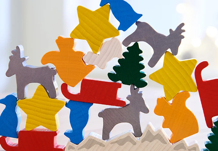 In Animal Upon Animal - A Christmas Stacking Game, players compete to be the first to place all of their pieces onto the growing Christmas pyramid.