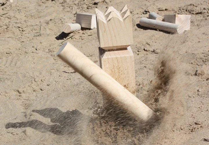 Kubb is a popular outdoor game in which the aim is to knock over wooden skittles by throwing sticks at them. Knock over the skittles and the King, but be careful – if you knock over the King before all the other skittles are down, your opponent wins.