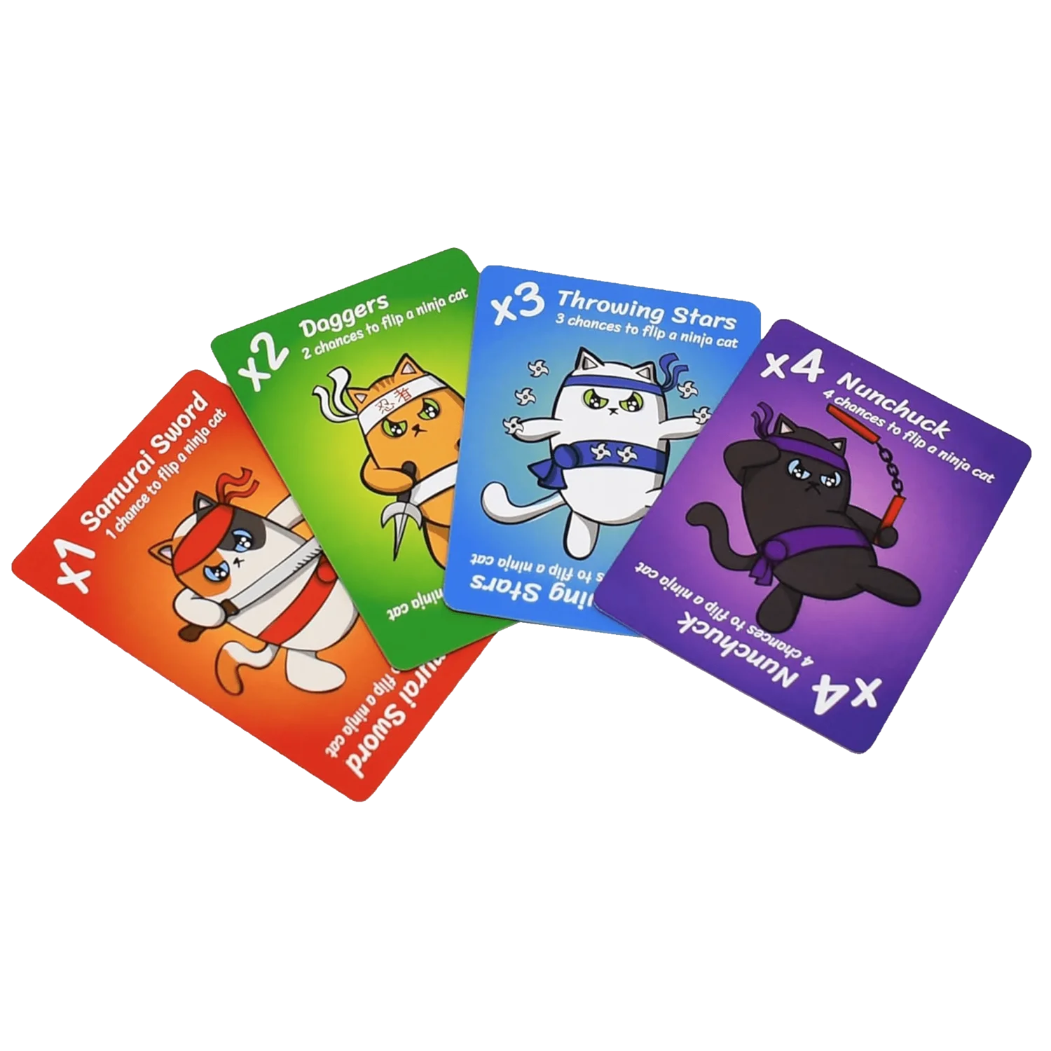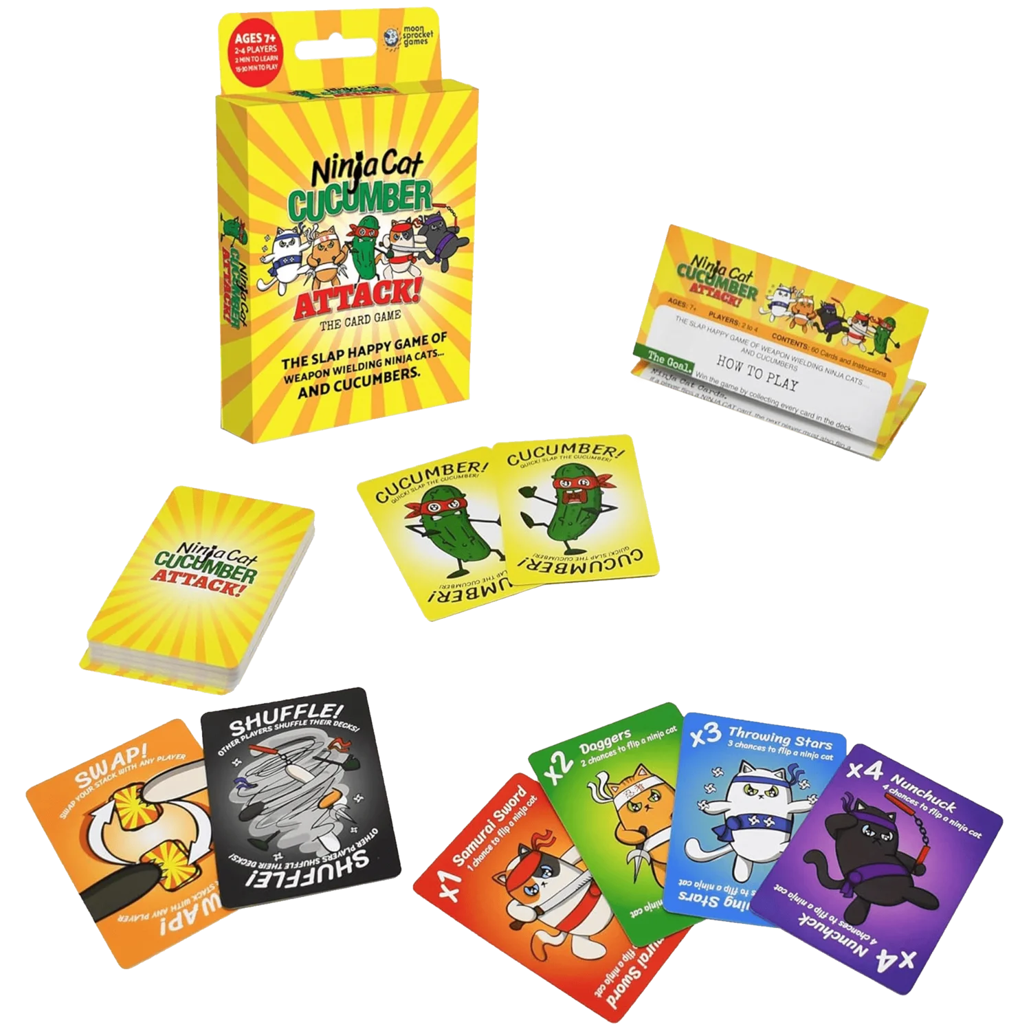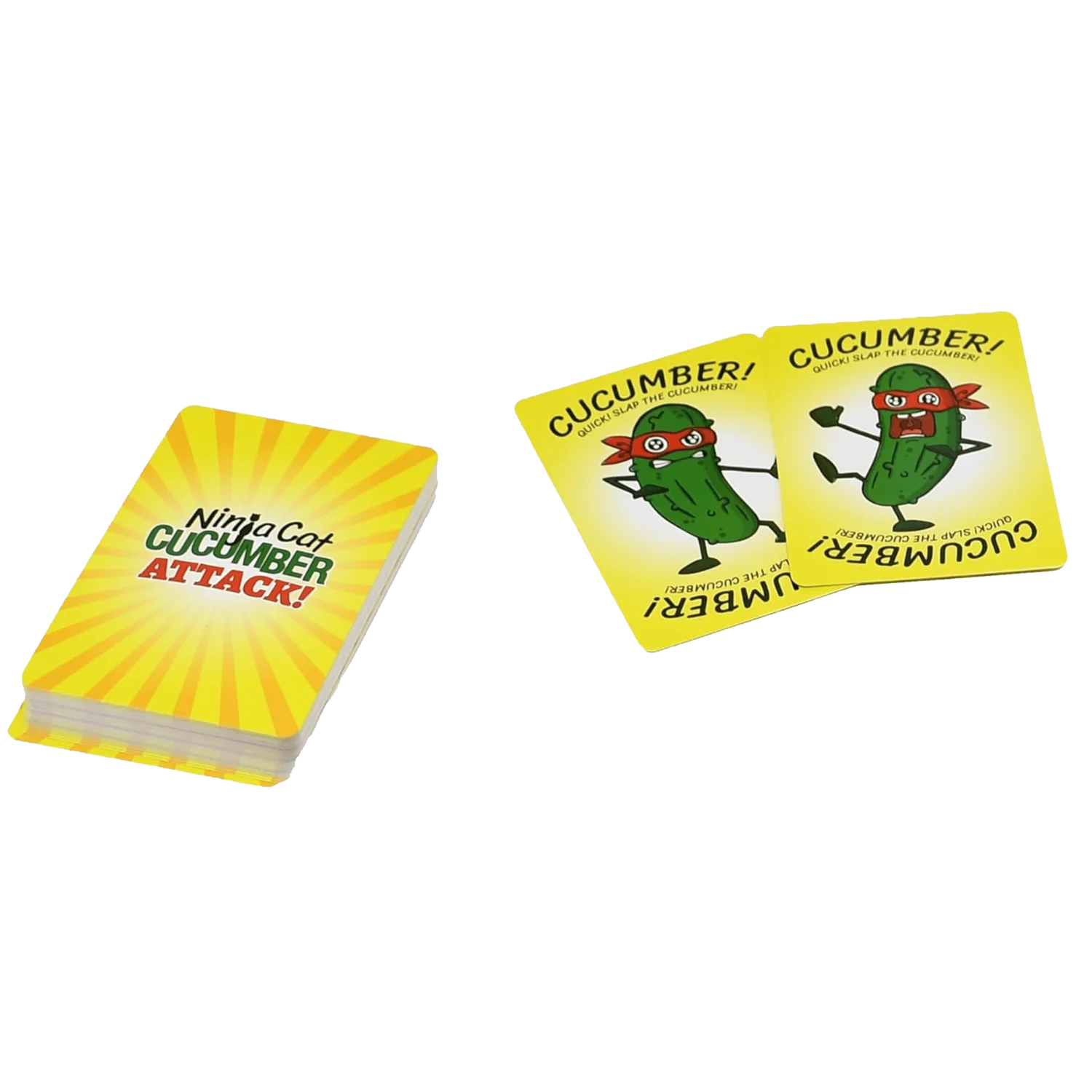Get slapping in this exciting fast-paced game where Ninja Cats battle and Cucumbers attack. Play against others to control the deck as you flip and slap your way to victory. Win cards by battling weapon wielding Ninja Cats, but be ready to steal the deck as you beat your opponents by slapping card combos first.