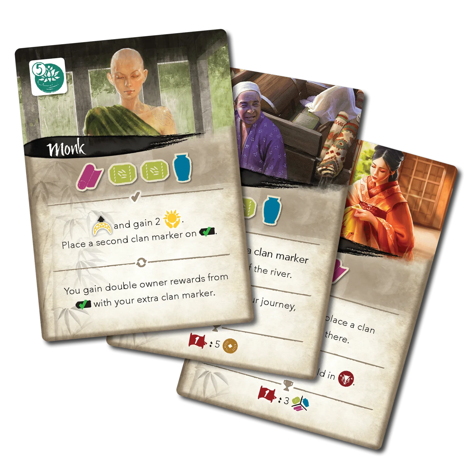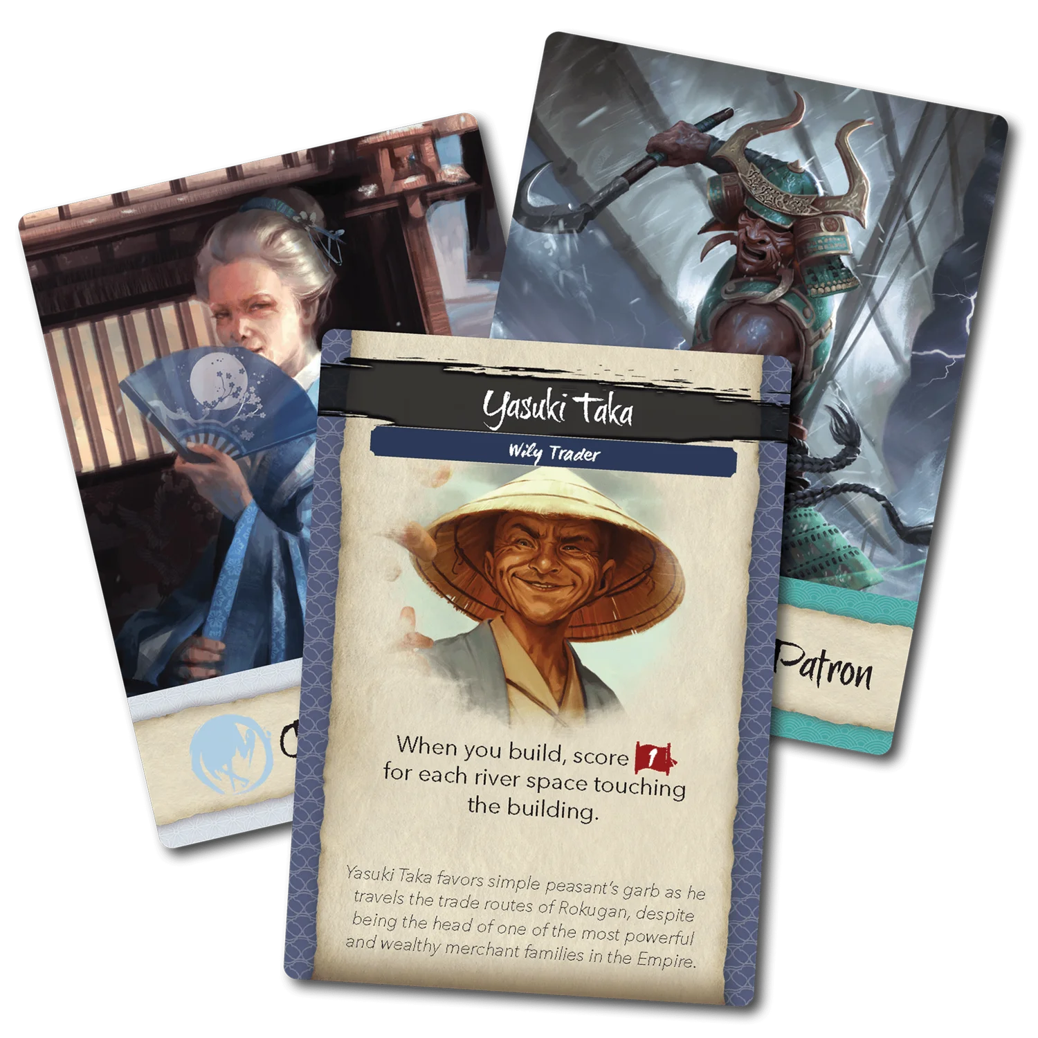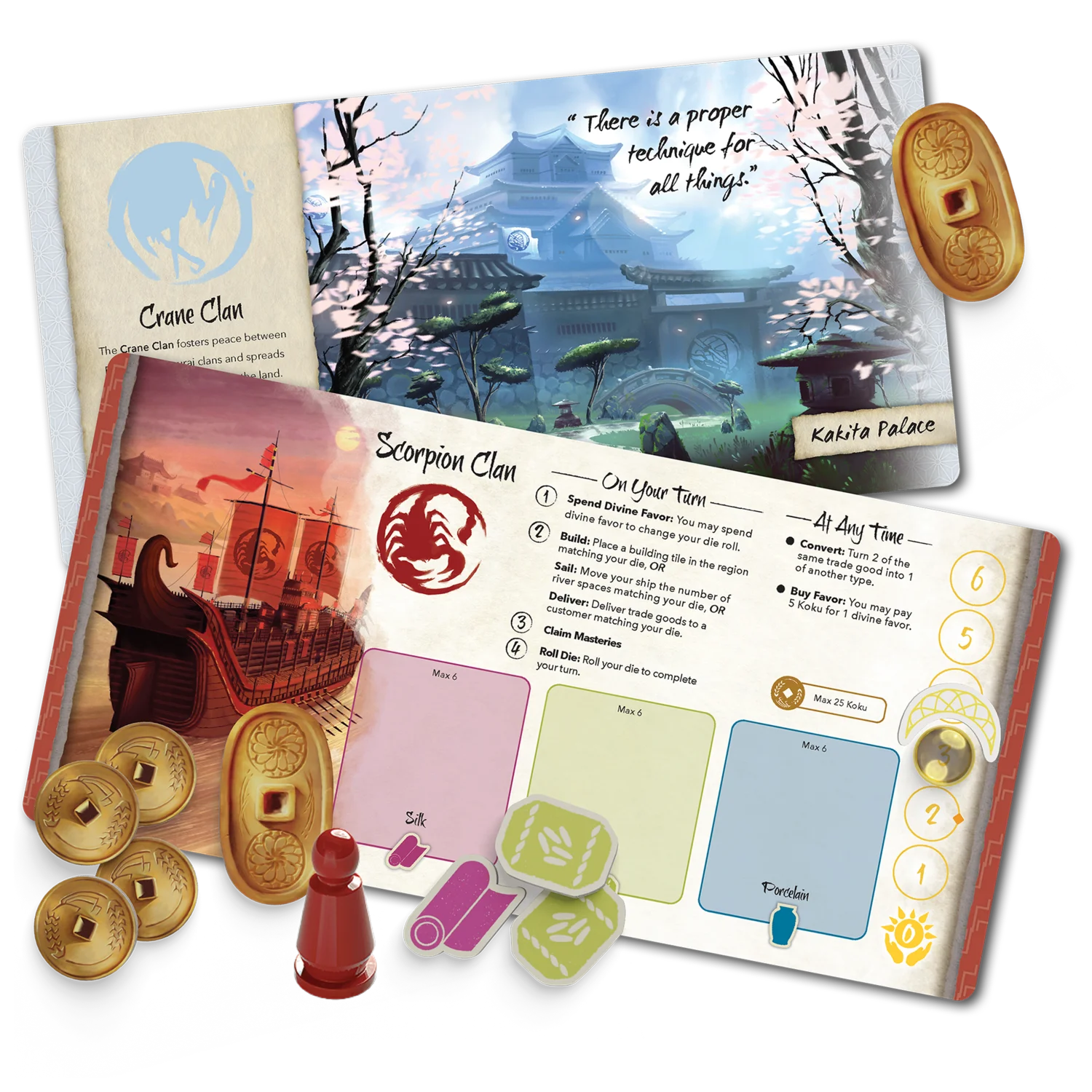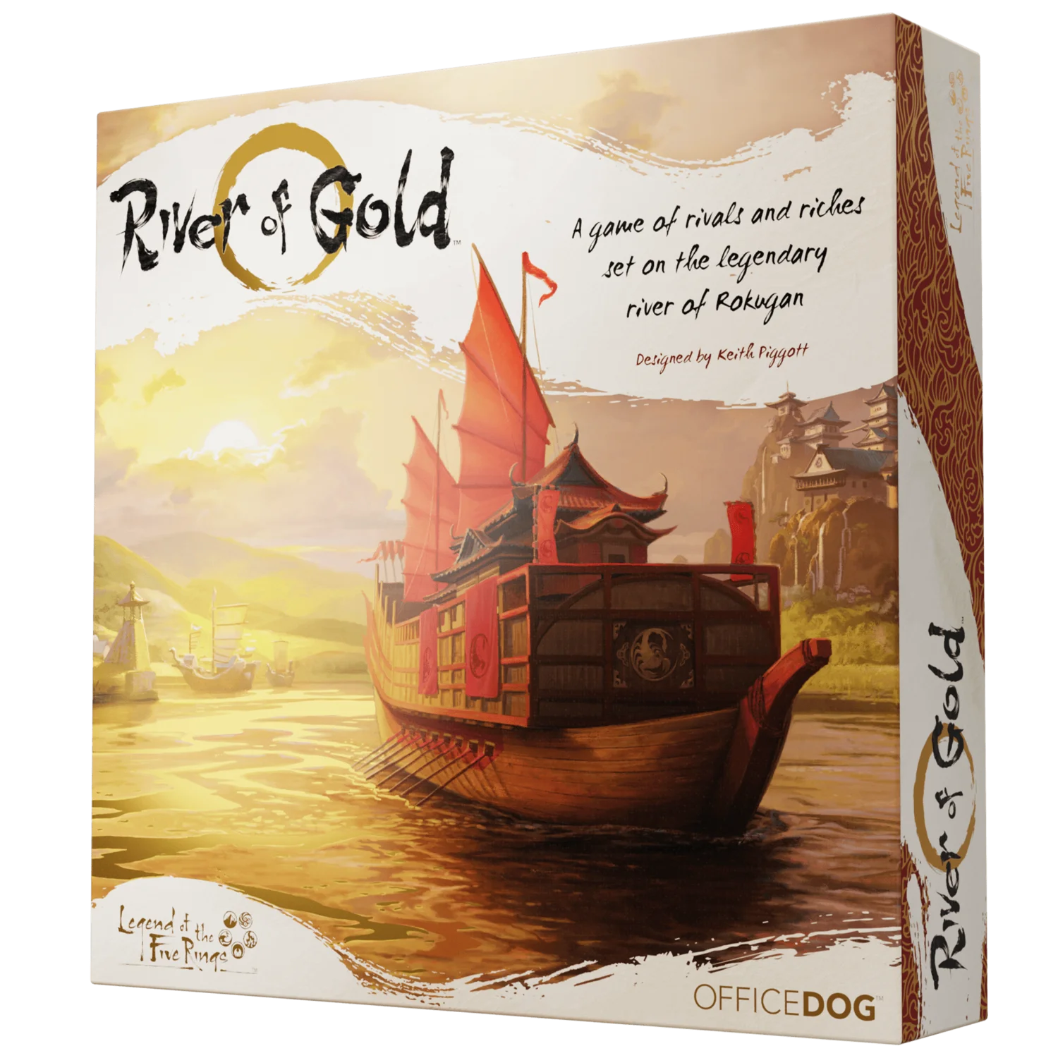 In River of Gold, players take on the role of river merchants allied with legendary samurai clans, each vying to exploit the river to earn wealth, glory, and wisdom. Will you invest in developing ports, markets, shrines, and more along the banks of the busy river? Or will you rely upon sailing the River of Gold, growing your wealth and influence through delivery contracts, visiting the nobility, and garnering a bit of divine favor during tough times?