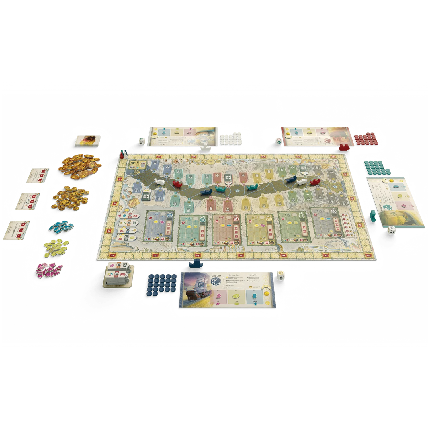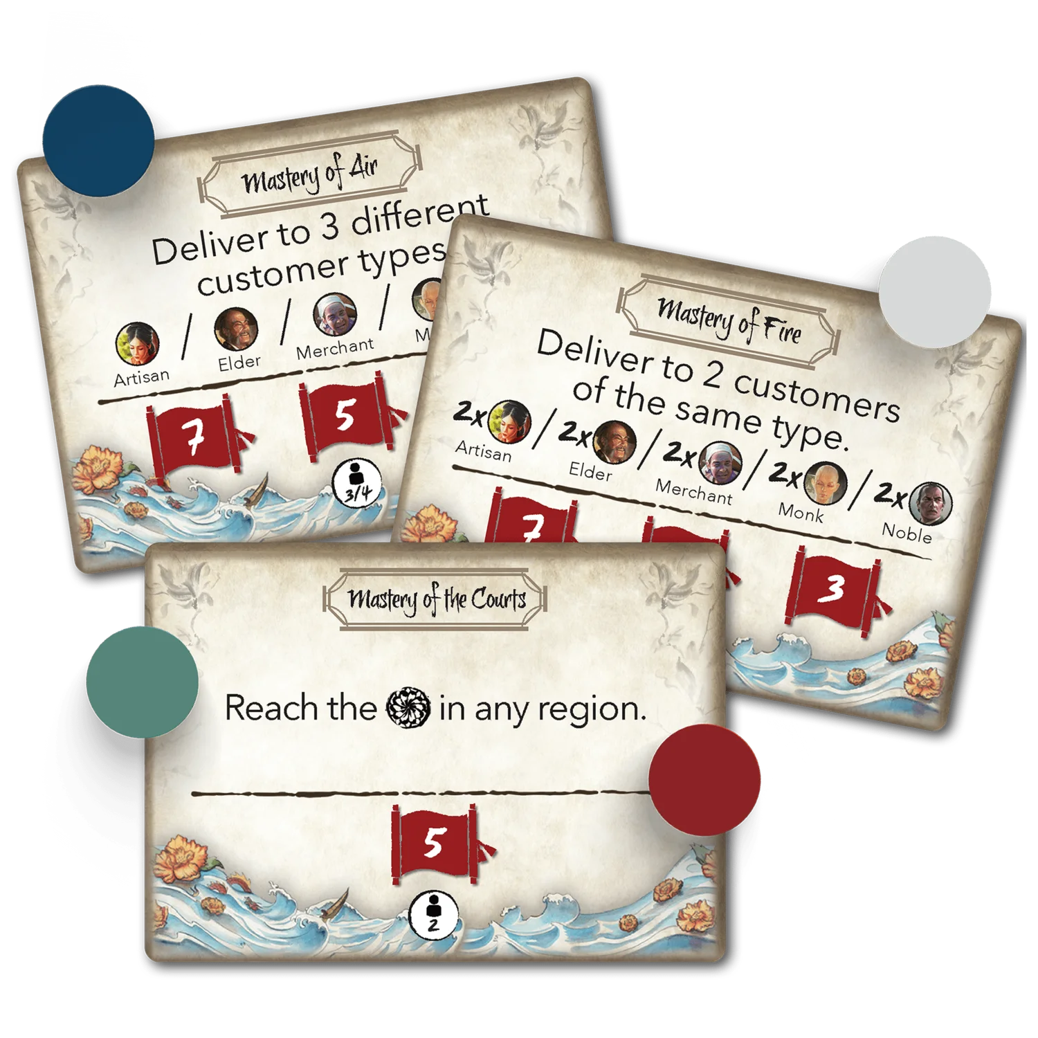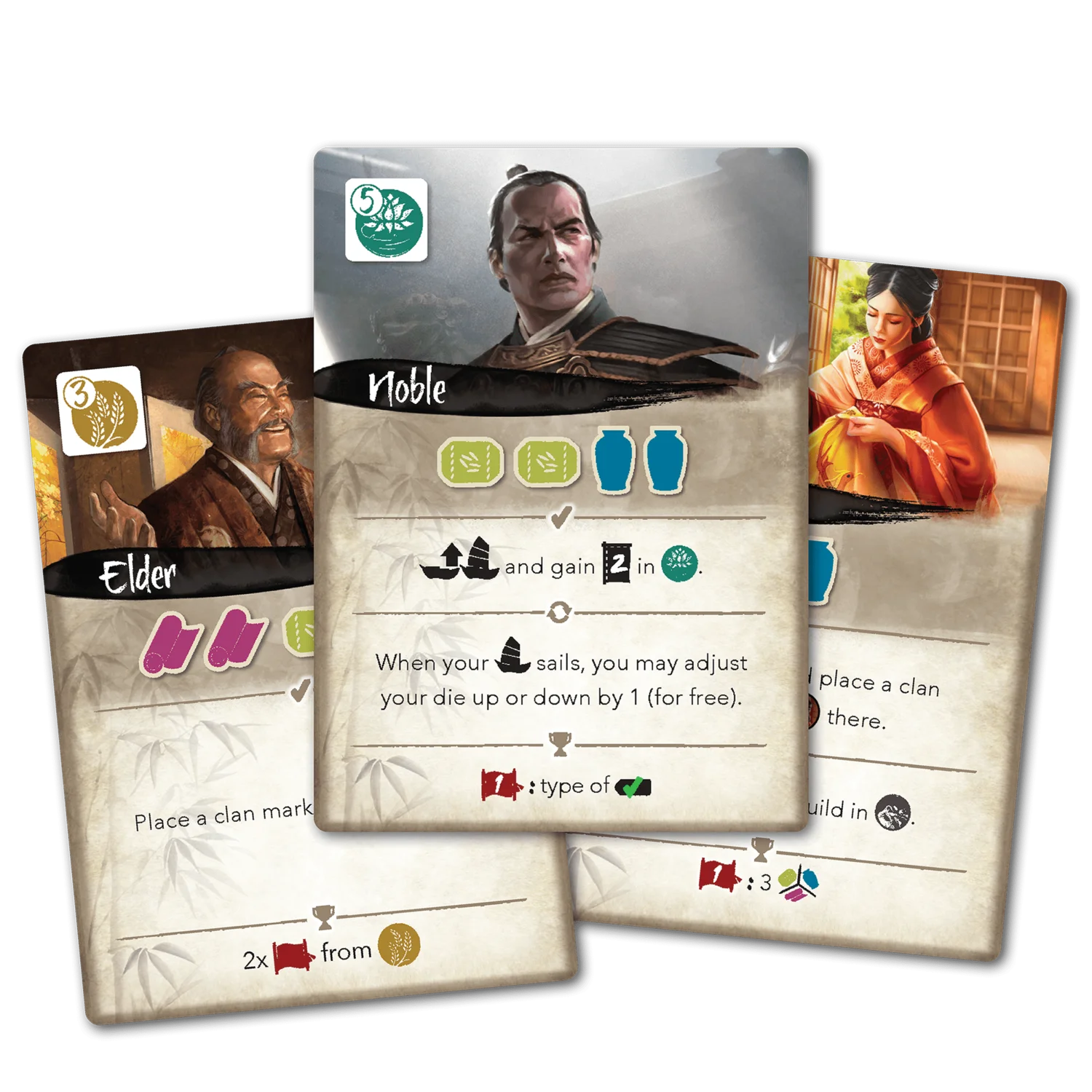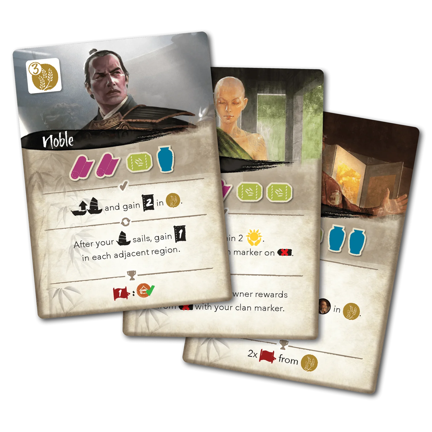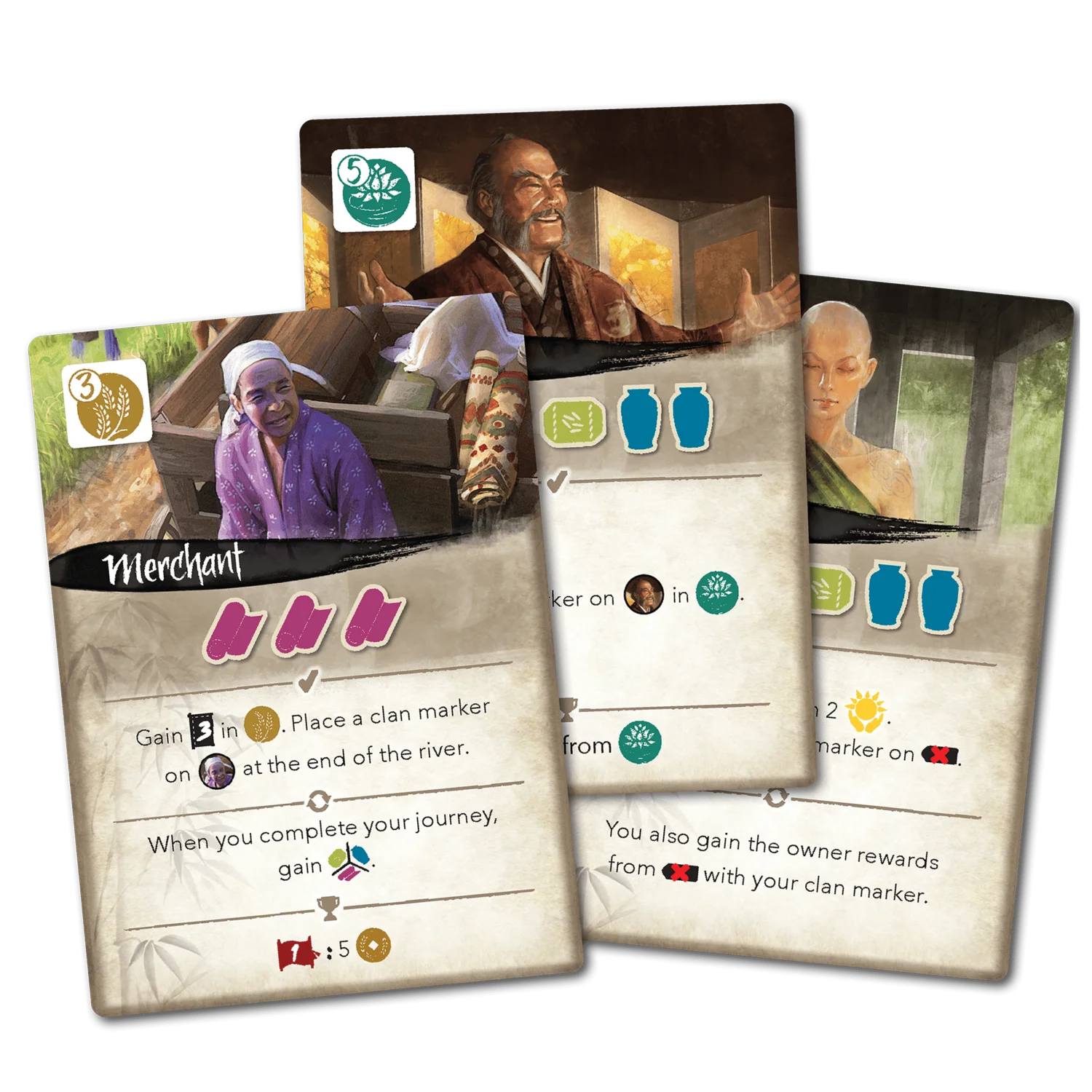 In River of Gold, players take on the role of river merchants allied with legendary samurai clans, each vying to exploit the river to earn wealth, glory, and wisdom. Will you invest in developing ports, markets, shrines, and more along the banks of the busy river? Or will you rely upon sailing the River of Gold, growing your wealth and influence through delivery contracts, visiting the nobility, and garnering a bit of divine favor during tough times?