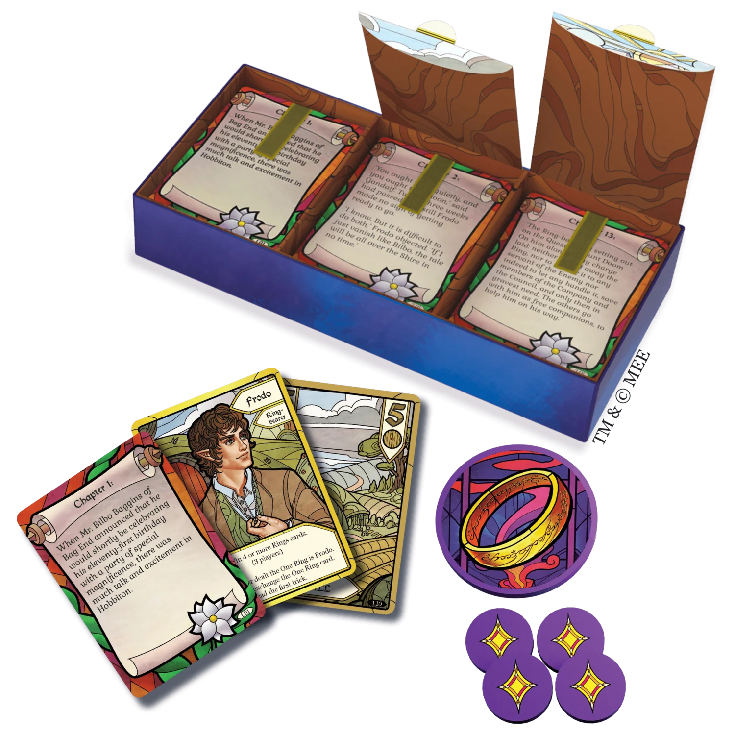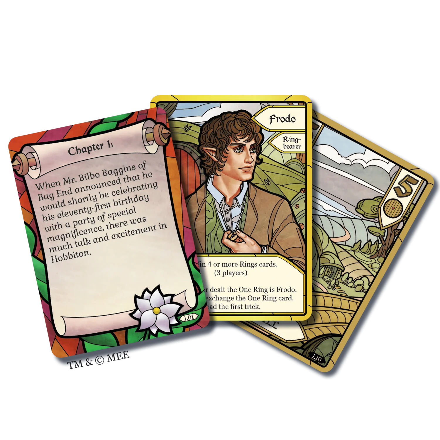 Follow the key story beats of the iconic fantasy tale by J. R. R. Tolkien, starting with Bilbo Baggins’ Eleventy-First birthday party in Bag End. Players are taken through eighteen total chapters chronologically, focusing on big story moments and the beloved literary characters among them. Each chapter introduces new challenges, characters, and items; slowly revealing cards that build toward the forming of The Fellowship. Story cards are used at the beginning of each chapter, featuring actual text from the book, to set the mood as you begin your adventure.