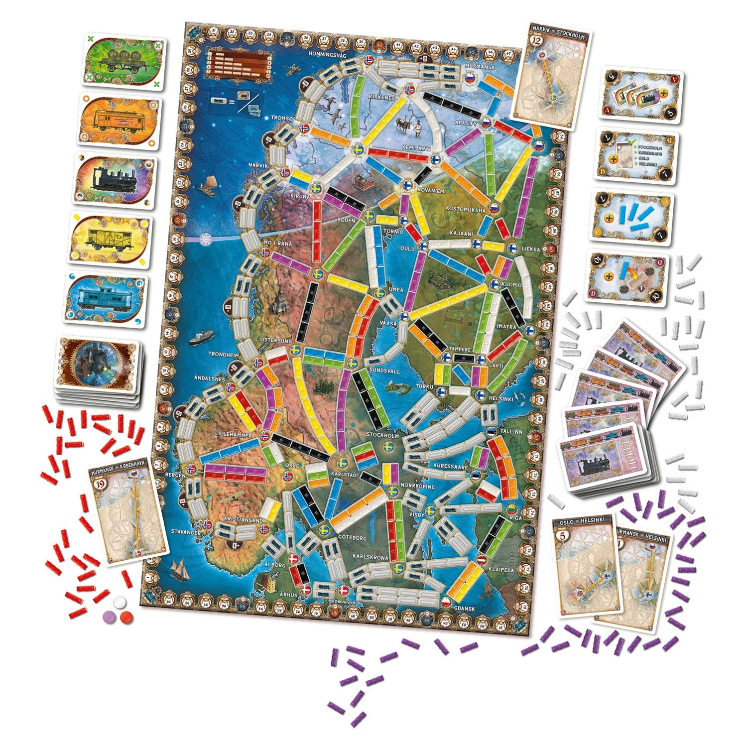 Ticket to Ride® – Northern Lights is the next installment in the best-selling train adventure series. Players use their Train cards to claim rail or sea routes and connect the cities listed on their Destination cards.