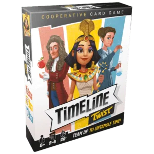 Timeline Twist reimagines the popular Timeline game, but now, you don't have to be a history buff to play! Each game is now a cooperative challenge where players either win or lose together. In this new edition, players team up, communicate and coordinate to find the best strategy to play all cards in the game. The team's goal is to get rid of all the cards the players have in hand, either by placing as many events as possible in the right order on the timelines, or by discarding them wisely.
