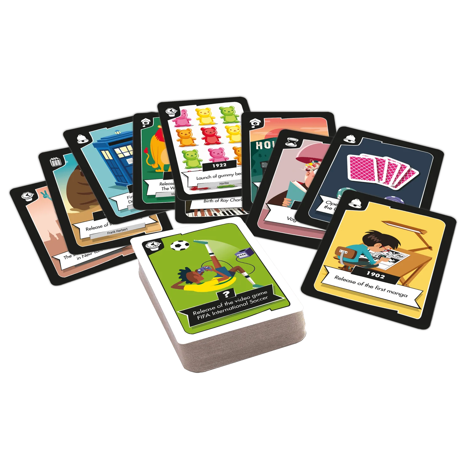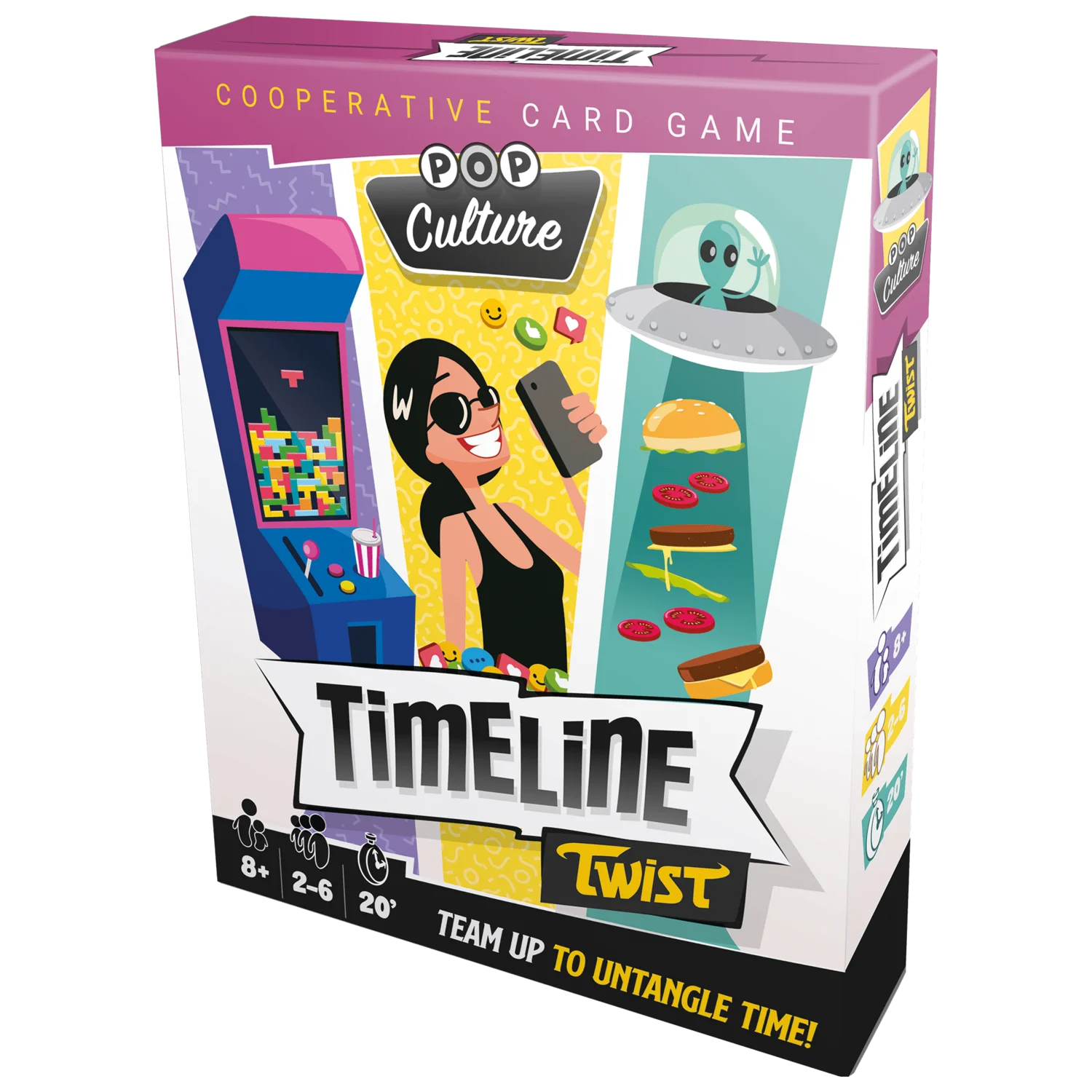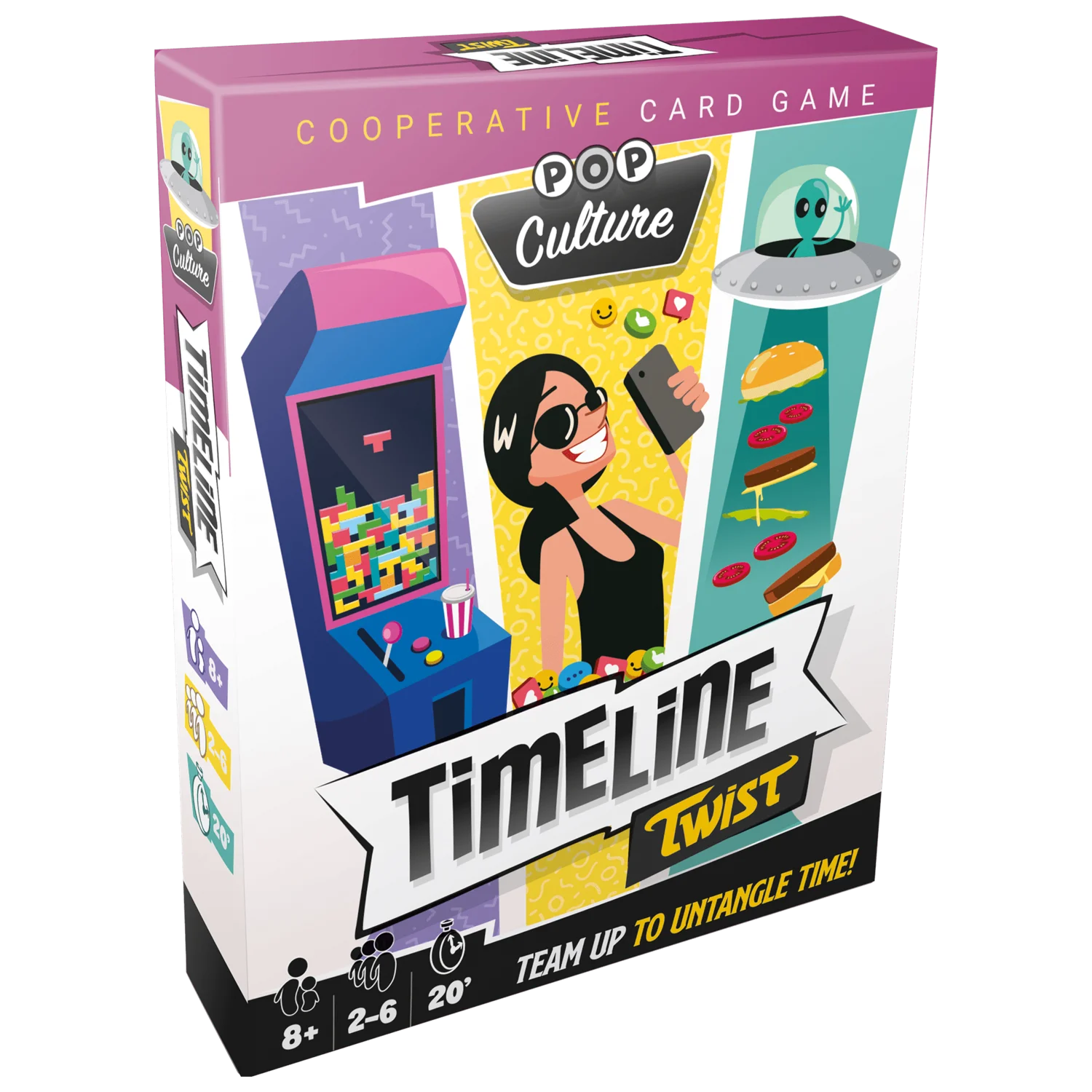 In the Pop Culture edition of Timeline Twist, put together a timeline of famous movies, games and celebrities. This edition is playable as a standalone and is also compatible with the classic Timeline Twist game. Mix both editions for even more fun!