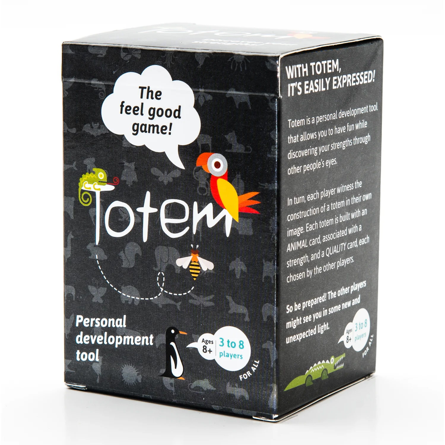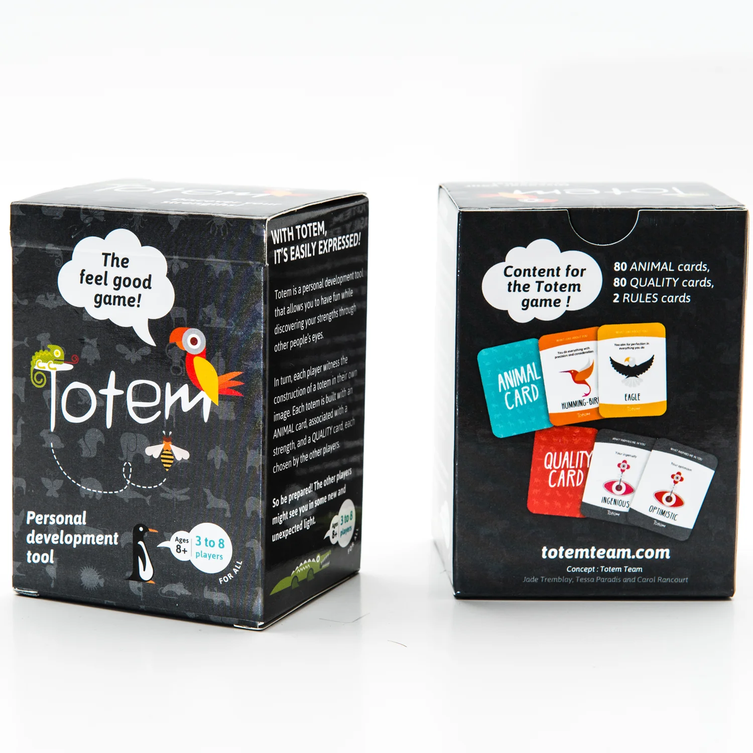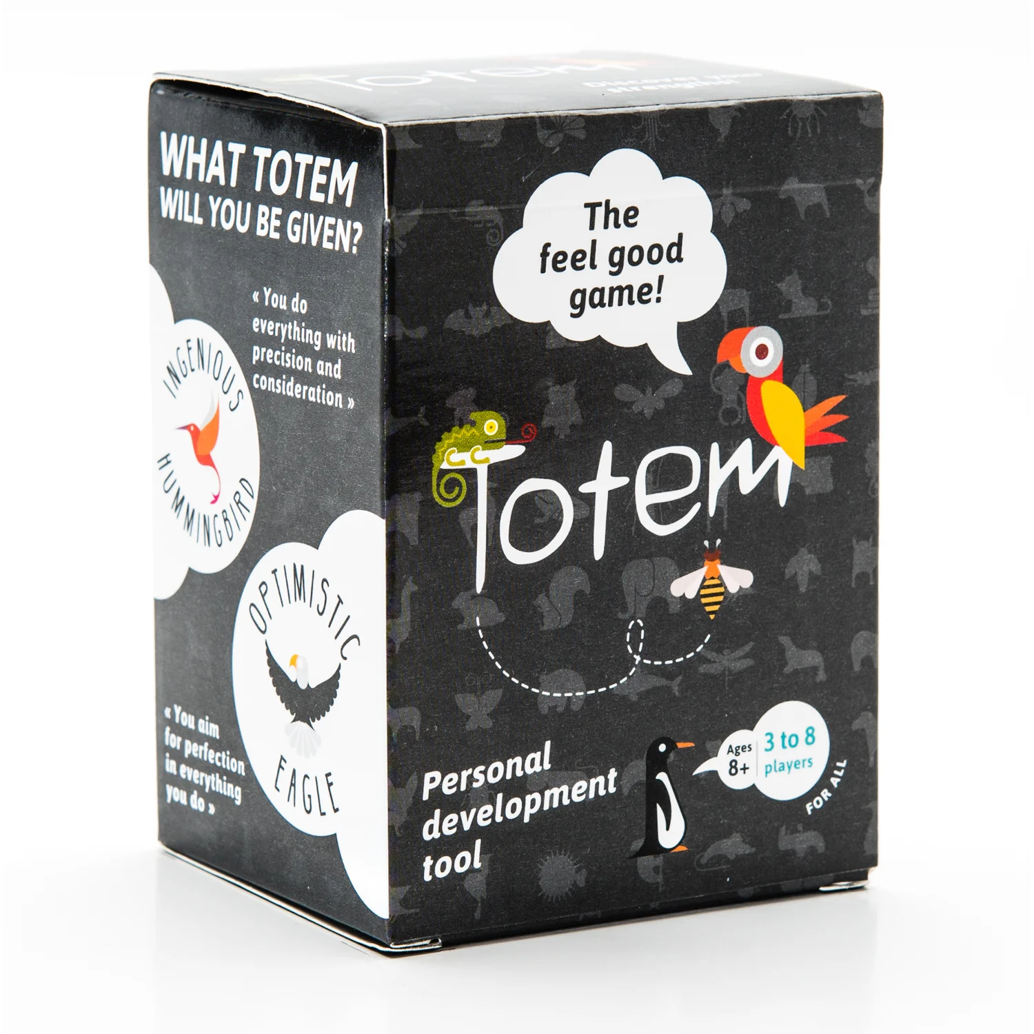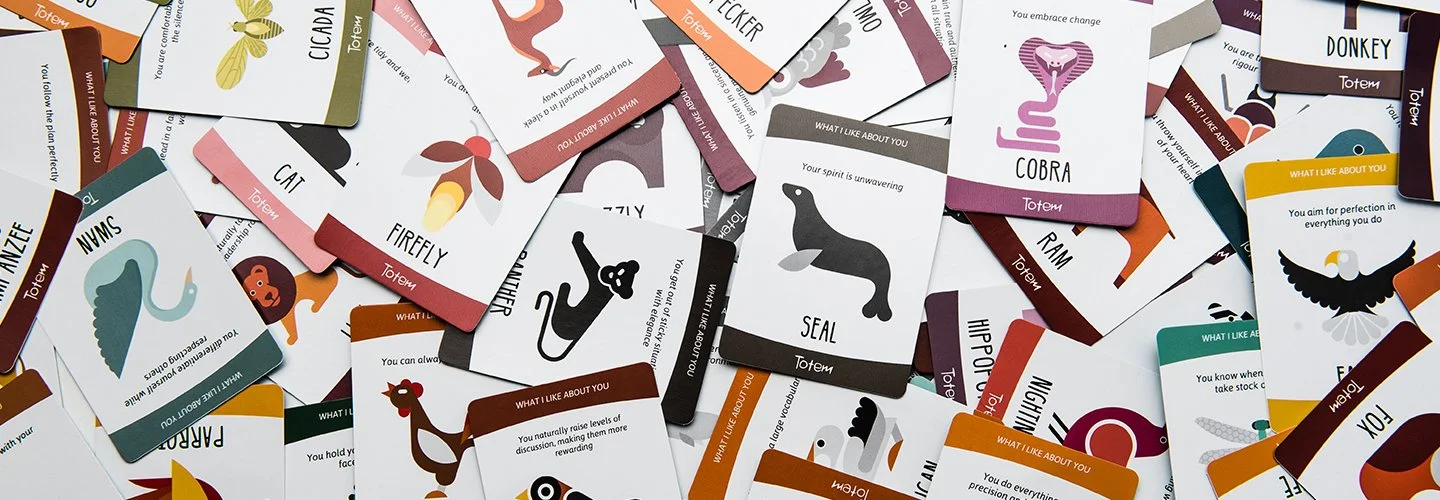 Imagine your friends telling you, in turn, what they appreciate most about you. This is what this tool does as you experience the construction of a personal Totem reflecting the best of your personality. The Totem is built using an ANIMAL card, associated with one of your strengths, and a QUALITY card, which describes a quality you have. Both cards are chosen and explained by the other players.