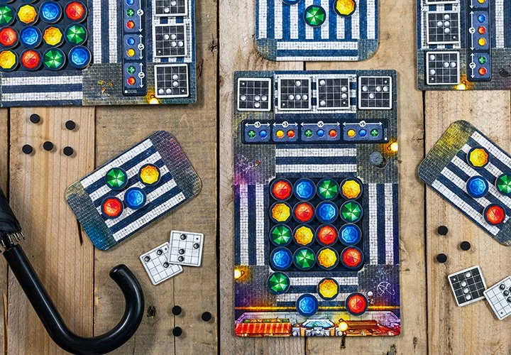 A crowd of umbrellas throngs the streets of New York, and seen from the sky, the colors dance... In Umbrella, each player orchestrates a "dance" of umbrellas in a street crossing. You start with a 4x4 square of umbrellas, with four each of four colors.