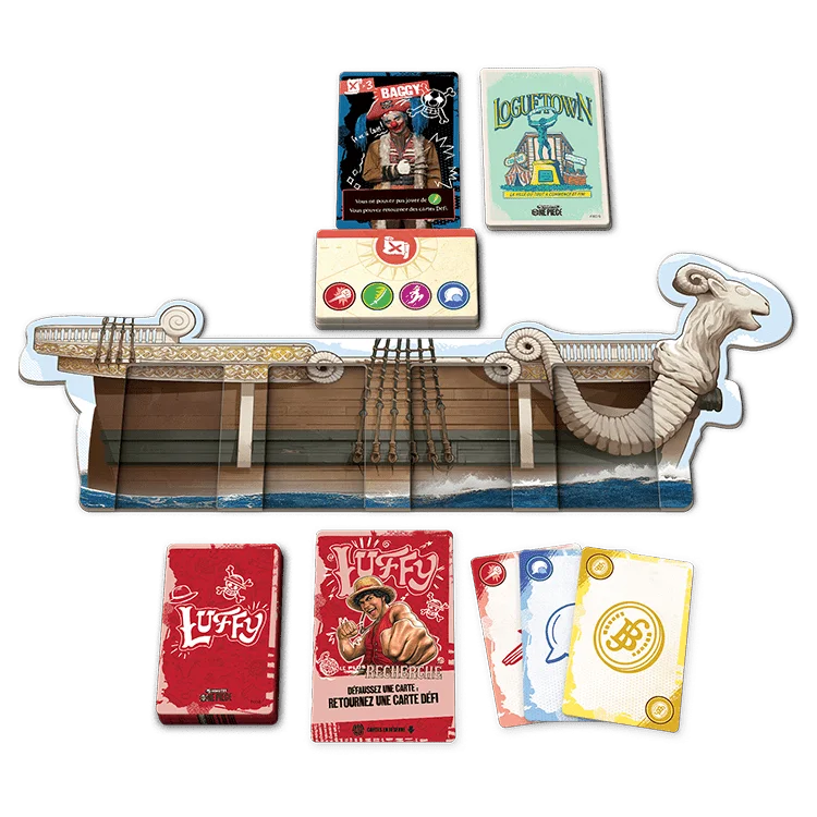PLONGEZ-VOUS DANS LES COMPOSANTS OFFICIELS DE ONE PIECE : Inclut 1 plateau de jeu Going Merry, 6 tapis de personnage, 150 cartes joueurs, 42 cartes d’aventure et 40 cartes défi qui donnent vie à l’univers de One Piece.