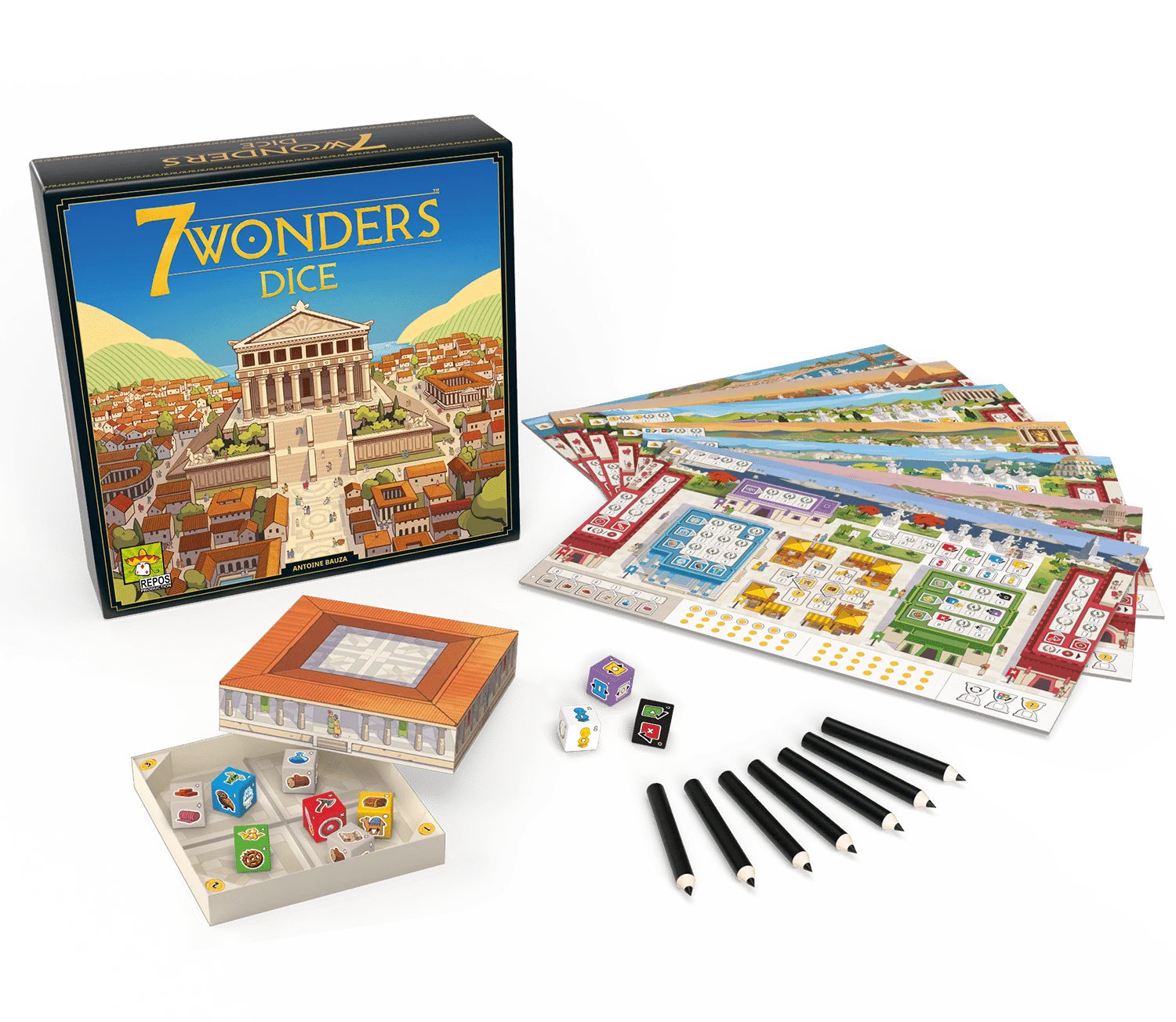 Dans 7 Wonders Dice, retrouvez l'univers emblématique du jeu le plus primé au monde dans un roll & write. Faites prospérer l’une des sept plus grandes cités du monde antique. Construisez votre merveille, faites progresser la science, concentrez-vous sur le commerce ou renforcez votre puissance militaire. Sans oublier de gérer votre budget ! À chaque tour, choisissez avec soin un dé dans la boîte Forum pour choisir l'axe de développement que vous souhaitez privilégier. Tous les joueurs agissent en simultané, avec les mêmes opportunités, c’est donc votre stratégie qui fera la différence.