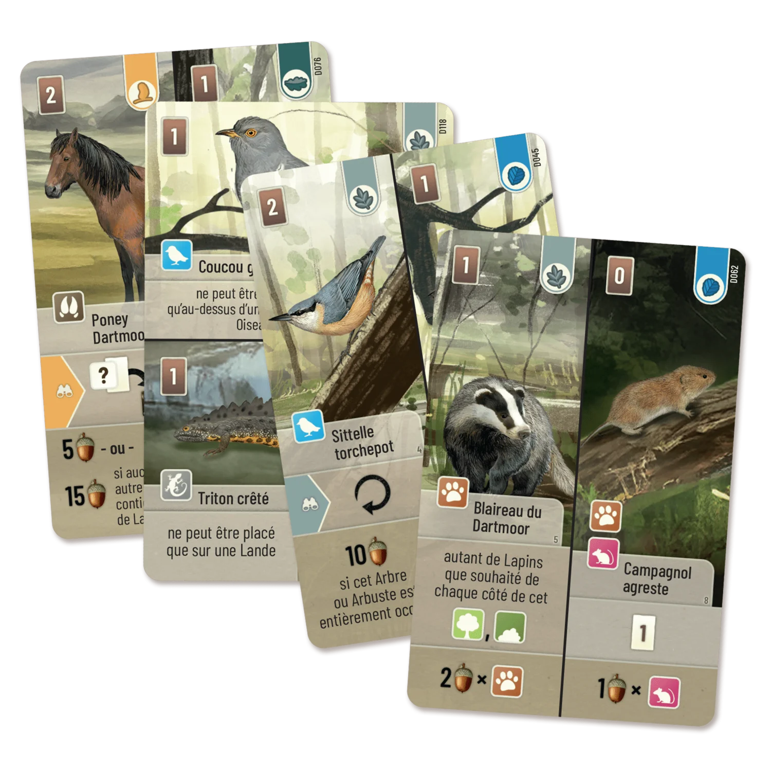 La grande nouveauté de Dartmoor est l’introduction des cartes Terrain, qui se posent à l’horizontale et servent de refuge ou de lieu d’alimentation pour des espèces différentes de celles liées aux arbres ou aux arbustes. En raison de la nature de ces terrains, les espèces ne peuvent être placées qu’au-dessus et en dessous d’une carte terrain. Les cerfs et d’autres animaux évitent par exemple les tourbières ou zones de tourbe des landes. Ils ont besoin d’eau, mais ne se sentiront pas en sécurité près des sources ou des ruisseaux. Les joueurs doivent donc réfléchir attentivement à l’endroit où placer leurs espèces.