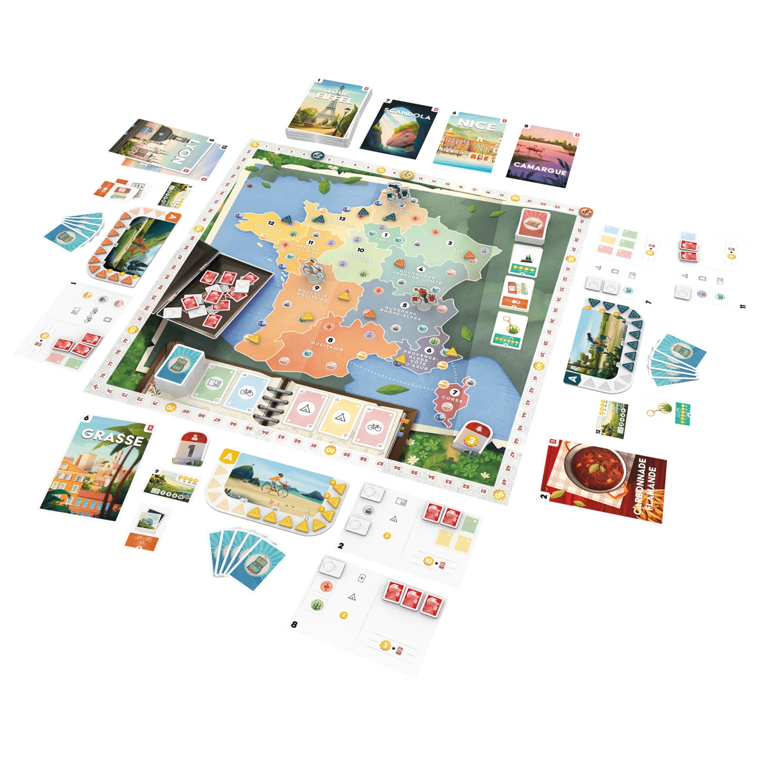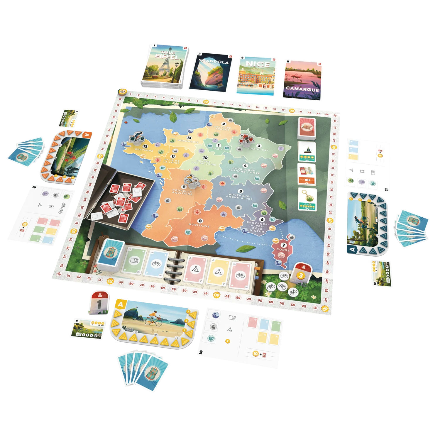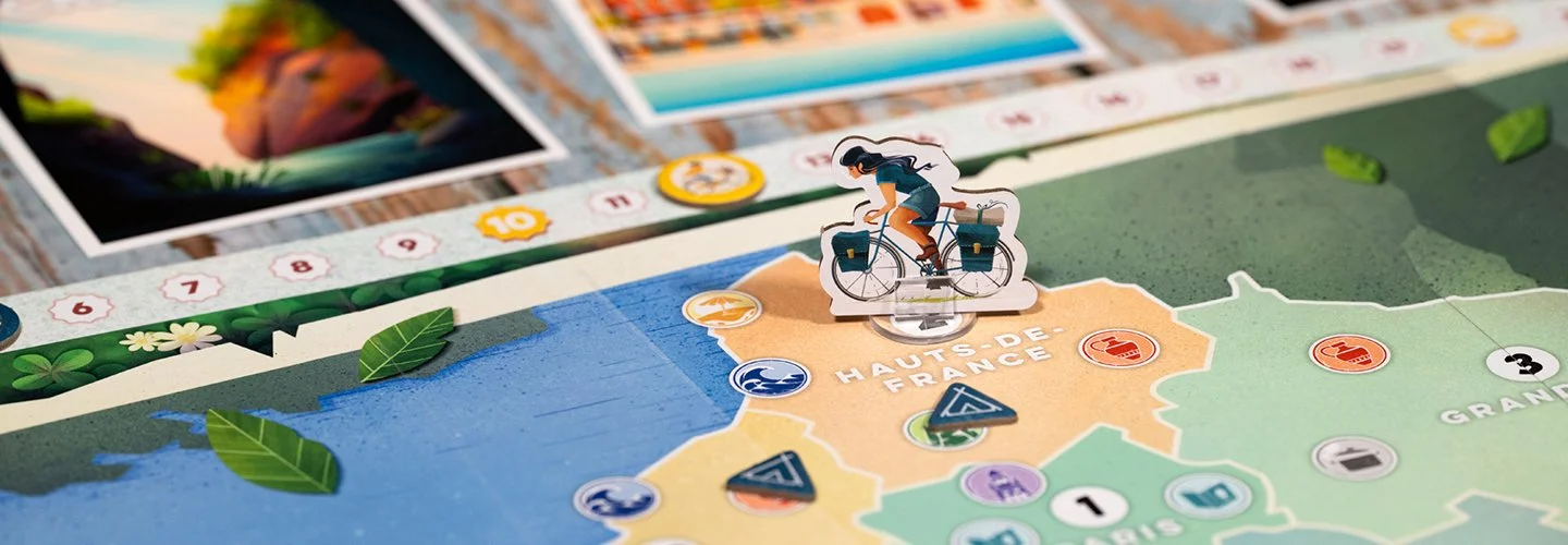 Parcourez les 13 régions de France sur le plateau de jeu, en planifiant votre itinéraire cycliste optimal.