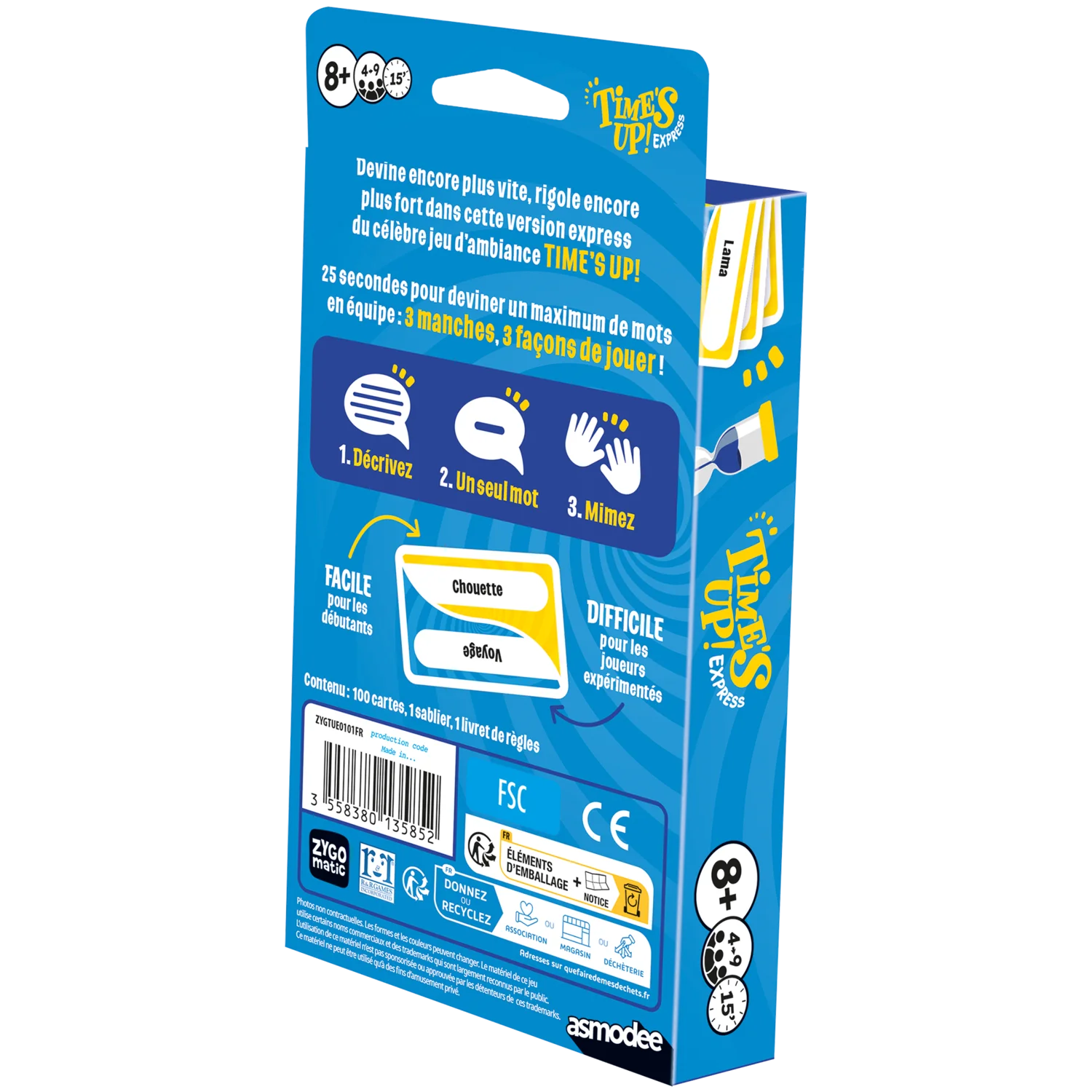 Time’s Up! Express est un jeu d’ambiance qui se joue en équipe. Au cours de 3 manches originales, faites deviner des mots à vos coéquipiers en parlant ou en mimant.
