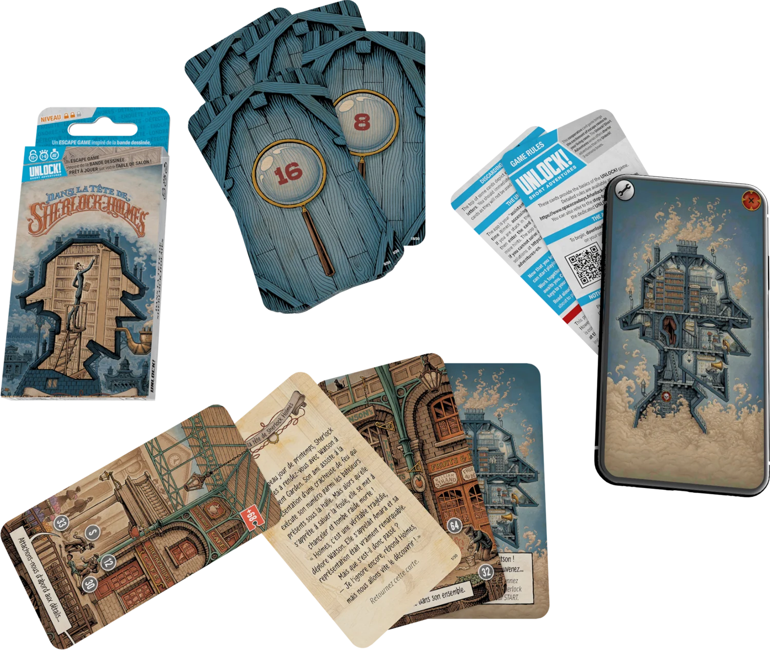 Une Escape room dans votre salon, dans un petit étui à emmener partout ! Lisez la première carte, lancez l’application gratuite et retrouvez-vous dans la tête de Sherlock Holmes, le plus grand détective de tous les temps ! Inspirée de la célèbre bande dessinée de Cyril Liéron et Benoit Dahan, cet escape game est d’un format un peu plus court, 40 minutes, que les habituelles énigmes des boîtes, mais toujours aussi palpitant et génial.